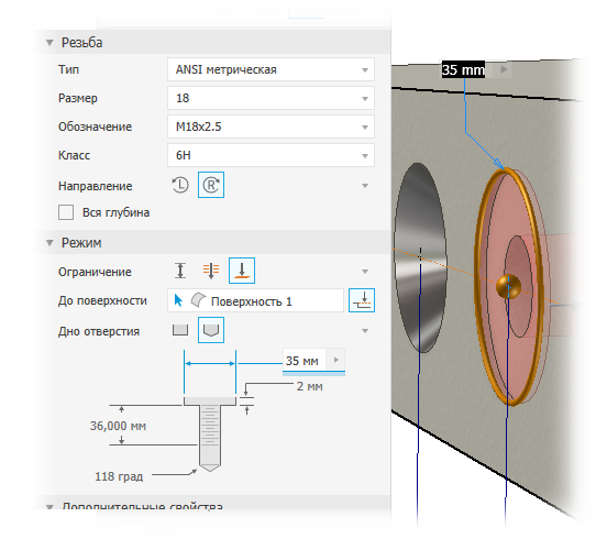 Резьба — активируется при выборе типа отверстия «Резьбовое» или «Конусное резьбовое». Задайте параметры отверстия.