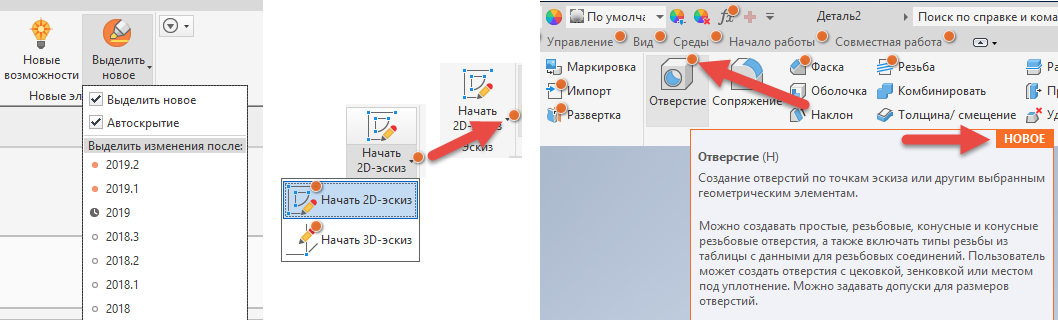 Каким образом можно использовать эту функцию? Представьте, что используется более ранняя версия, например 2018, и выполняется переход на версию 2019. Необходимо узнать, какие возможности добавлены или обновлены после версии 2018. Выберите 2018, и все новые или измененные команды после выпуска 2018 будут помечены значком. Или, например, выберите версию 2018.2, и значки появятся для команд, измененных или появившихся в версиях 2018.3, 2019 и 2019.1.
