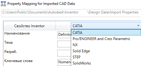 - В диалоговом окне «Сопоставление свойств для импортированных данных САПР» щелкните раскрывающееся меню и выберите формат, с которым требуется сопоставить стандартные свойства Inventor. Если инструмент сопоставления свойств запущен из диалогового окна импорта, по умолчанию автоматически выбирается формат, соответствующий формату импортируемого файла.