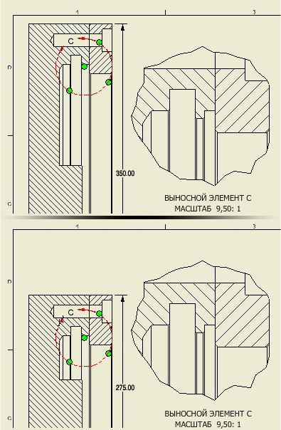 В среде работы с чертежами с помощью команды "Добавить" можно связать описания выносных элементов с базовым видом. Если размеры или позиционные связи геометрии базового вида изменяются, прикрепленный вид смещается вместе с заданной пользователей вершиной прикрепления.