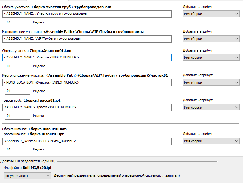 Укажите, как следует создавать файлы и папки труб и трубопроводов. Настройте схему именования с помощью параметров в раскрывающемся списке «Добавить атрибут».