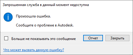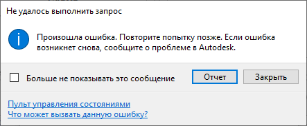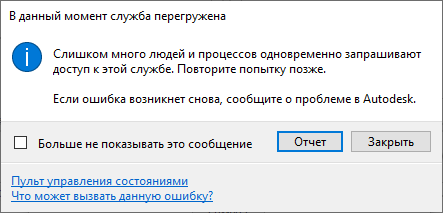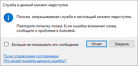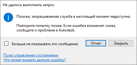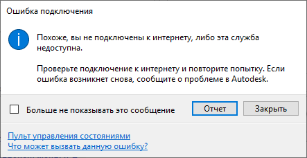 Если вы подключены к интернету, но сообщение об ошибке по-прежнему отображается, перейдите по ссылке Пульт управления состояниями и проверьте статус службы. Если на странице Пульта управления состояниями служба отображается как работающая, но сообщение об ошибке все равно появляется, обратитесь в службу поддержки продуктов Autodesk. |