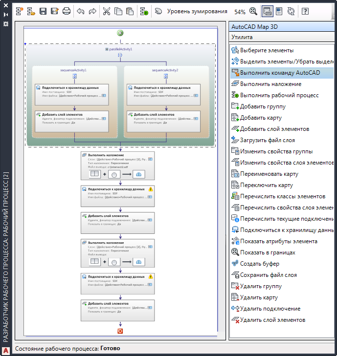 Если встроенные рабочие процессы не отображаются в раскрывающемся списке рабочих процессов, выберите пункт Открыть рабочий процесс из файла в этом списке и перейдите в папку Program Files\Autodesk\AutoCAD Map 3D 2020\Sample\Workflow. Выберите файл .xoml для открываемого рабочего процесса.