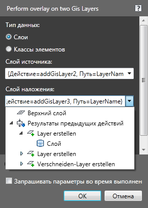 Имеется контекстное меню для добавления действия и автоматического связывания с предыдущим действием. Щелкните действие правой кнопкой мыши и выберите действие, которое следует добавить. Например, щелкните правой кнопкой мыши действие наложения и выберите пункт "Добавить слой элементов", чтобы создать новый слой Диспетчера отображения, в котором сохранится результат операции наложения.