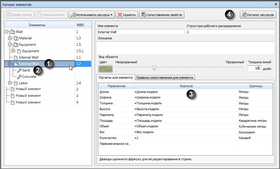 Каталог элементов представляет собой структурированную базу данных. Каталог элементов и каталог ресурсов имеют одну и ту же структуру, дерево выбора, панель переменных и общие сведения. Элементы в каталоге элементов могут быть непосредственно связаны с объектом модели, таким как стена или окно. Элементы могут существовать самостоятельно или могут содержать ресурсы.