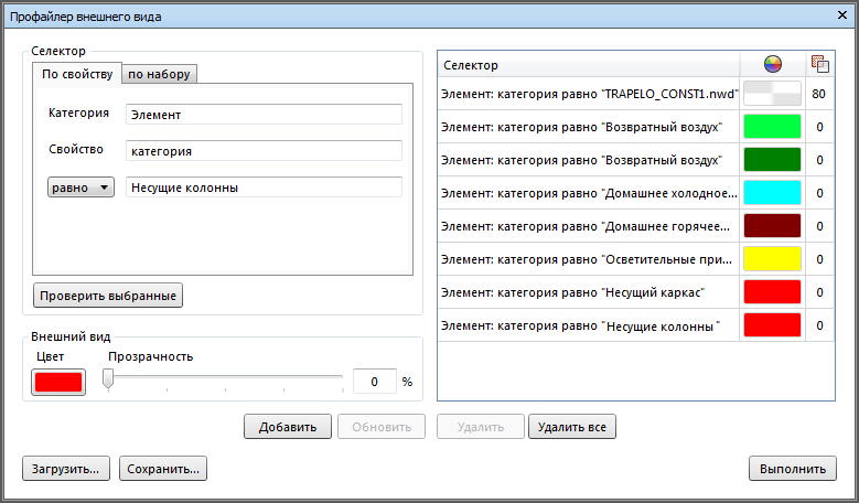 Компонент "Профиль внешнего вида" позволяет настраивать профили внешнего вида на основе наборов (поиск и выбор) и значений свойств и использовать их для цветовой маркировки объектов в модели, чтобы дифференцировать типы систем и визуально определять их состояние. Профили внешнего вида можно сохранять в виде файлов DAT и предоставляться для использования другим пользователям Autodesk Navisworks.