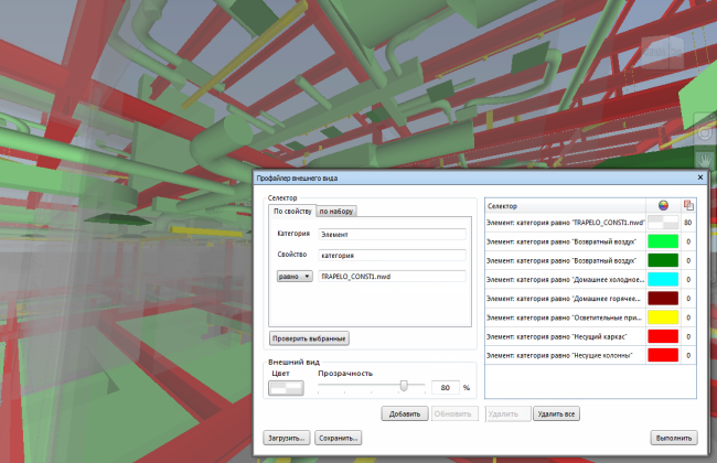 Совет: Если первым использовать селектор, который применяет ко всей модели серый цвет с прозрачностью 80%, другие примененные цвета будут лучше выделяться.