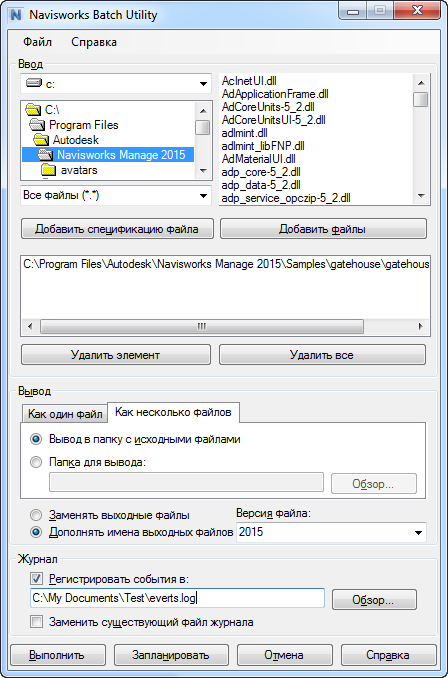 - В диалоговом окне Autodesk Navisworks используйте область "Ввод" для создания списка проектных файлов, которые следует преобразовать.