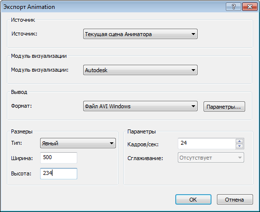 Процедура экспорта анимации в файл AVI или в последовательность файлов изображений