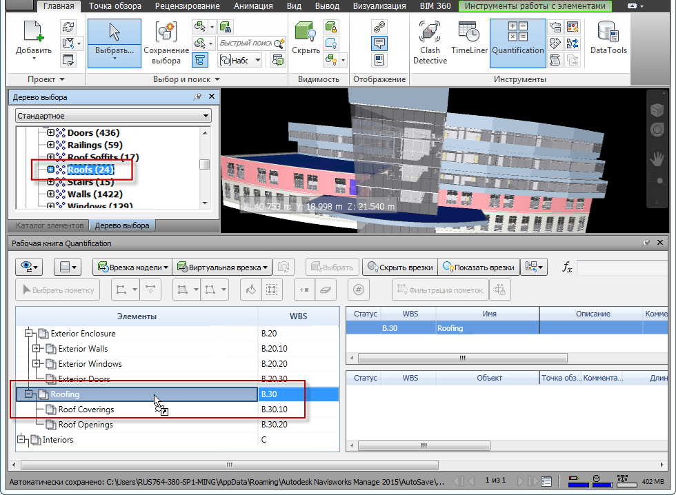 При создании выборки по 3D - модели используются проектные данные, пришедшие с исходными файлами. Приложение извлекает объекты из модели и отображает их в виде элементов в рабочей книге Quantification.