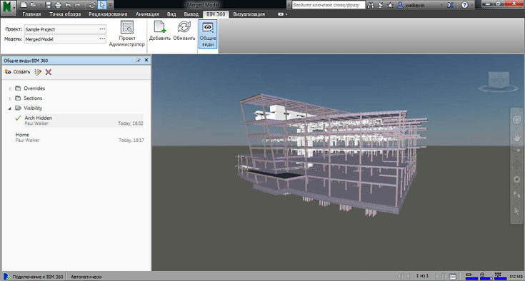 Щелкните "Общие виды" для переключения между BIM 360 Glue и Navisworks. Общие виды синхронизированы в режиме реального времени.