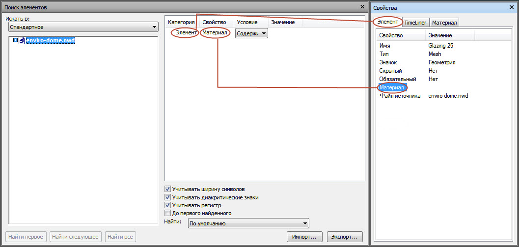 Основными этапами этого процесса являются поиск элементов с определенными свойствами модели в окне поиска элементов, экспорт этих свойств в файл XML и их изменение для сопоставления требуемым свойствам выборки. Для удобства можно расположить окна поиска и свойств рядом: