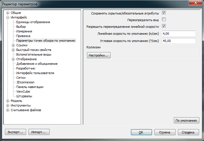 - В окне редактор параметров разверните узел "Интерфейс" и щелкните "Параметры точек обзора по умолчанию".