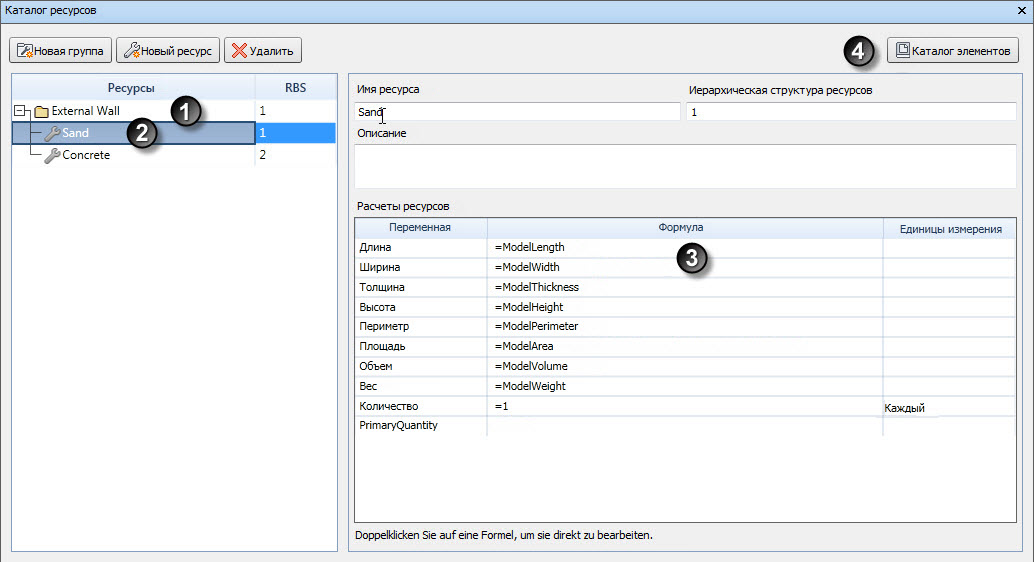4. Каталог элементов Щелкните для переключения между каталогами ресурсов и элементов.