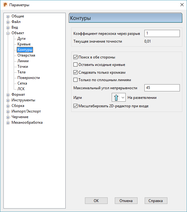 - Коэффициент перескока через разрыв - определяет разрыв, используемый для поиска пригодных траекторий во время создания контура. Данный коэффициент зависит от общего допуска и может изменяться во время создания контура. Для удобства текущее значение общей точности отображено под данным параметром.