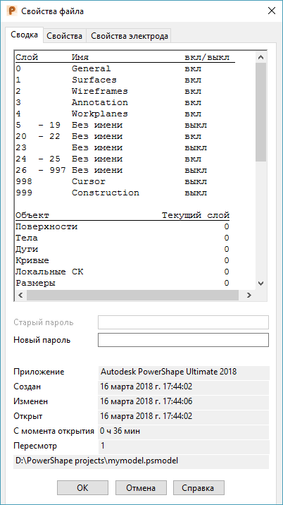 Страница Сводка диалога Свойства файла содержит информацию о слоях и объектах для текущей модели.