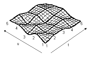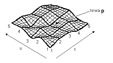 Значения t и u однозначно определяют точку, например, точку p на поверхности. Таким образом, точка p может быть задана глобальными пространственными 3D координатами (x, y, z) или параметрическими пространственными 2D-координатами (t и u). На рисунке внизу, параметрические пространственные 2D координаты точки Р (3.5, 2.75).
