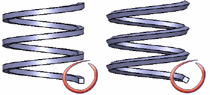 Пример ниже показывает две твердотельные четырехугольные спирали. Спираль слева была создана с Радиусом скругления, равным 0. Спираль справа была создана с Радиусом скругления, равным 3, и подсвечена, чтобы показать скругления.