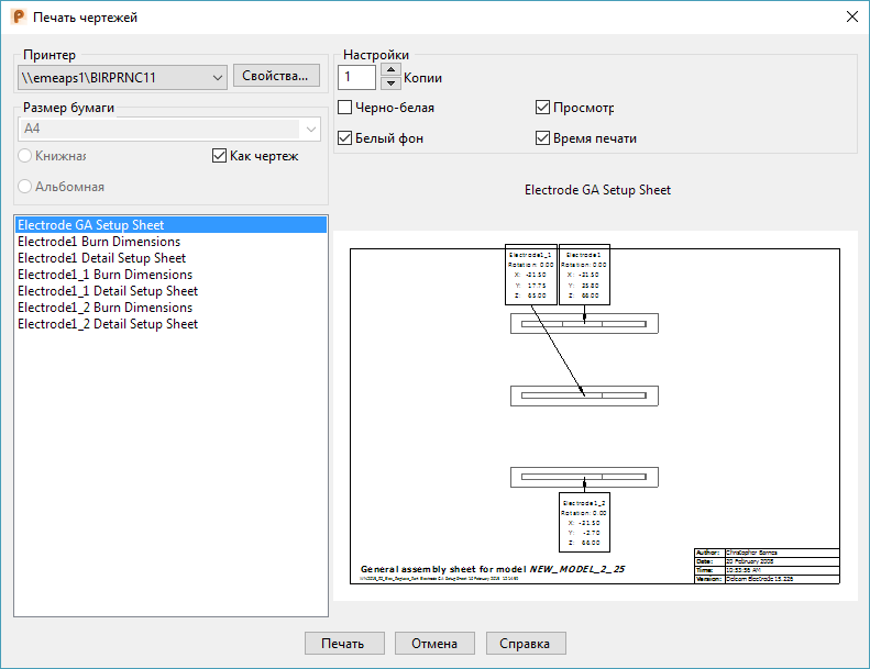 - Время печати - выберите эту опцию для печати чертежа с указанием времени.
