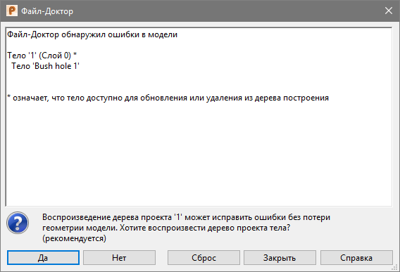 Тип предлагаемого Файл-Доктором исправления зависит от ошибок, найденных в модели. Если возможно, Файл-Доктор предложит исправление, которое не удаляет геометрию модели, например, воспроизведение или удаление дерева построения тела.