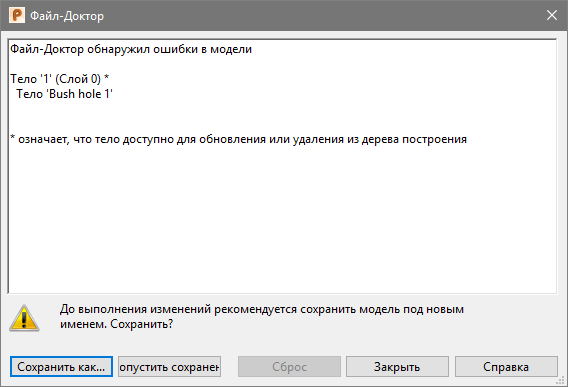 Прим.: Избавление от сбоя невозможно до тех пор, пока вы не сохраните исправленную модель.