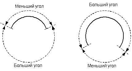 Внутренний и внешний углы определяются величинами секторов дуги, как показано на рисунке: