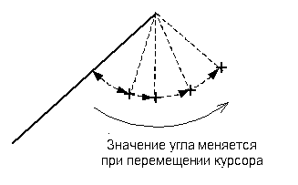 Выберите линию. Отобразится соответствующий угол, тянущийся от выбранного конца линии к курсору. При перемещении курсора угол меняется: