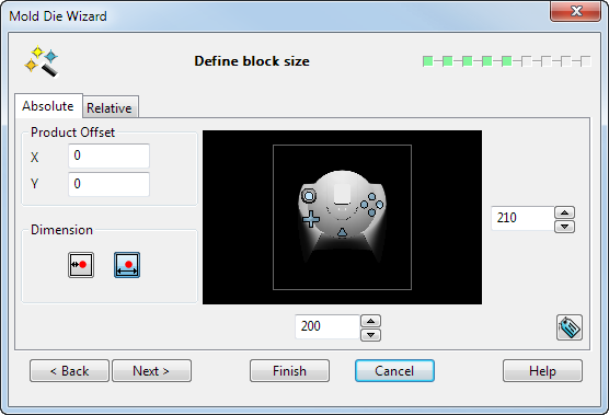 Вокруг выбранного объекта автоматически создаётся блок, если он ещё не был задан до входа в Мастер формообразующих. Размеры блока могут быть заданы абсолютными или относительными значениями. В Мастере содержится изображение закрашенной детали и каркасного блока. Можно поворачивать, менять масштаб и перемещать изображение мышью.