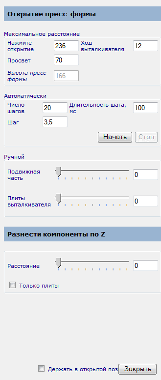 - Начать - начинает открытие и закрытие инструментов пресс-формы.