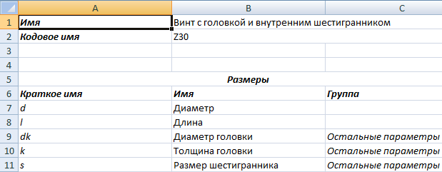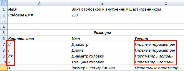 - Параметры головки в ячейке Группа для задания параметров dk и k.