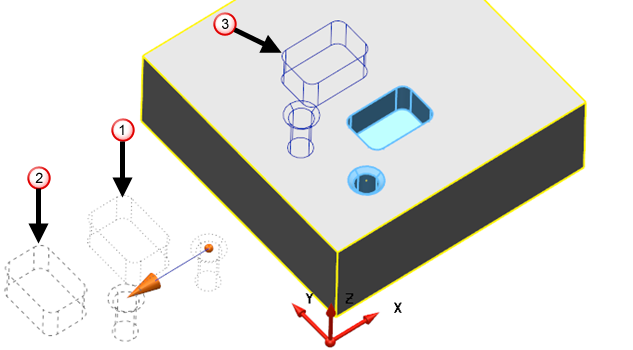 - Пунктирные контуры элементов после перемещения на 20 мм по оси Х.
