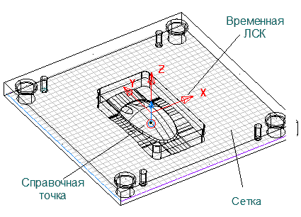 Данная сетка представляет плоскость, в которой лежат отверстия. Кроме того, в центре ограничивающей рамки создаётся временная ЛСК. Она задает начало координат плоскости, в которой создаются отверстия. Справочная точка также создается. По умолчанию она касается нижней плоскости ограничивающей рамки вокруг пресс-формы и располагается прямо под началам координат временной ЛСК.