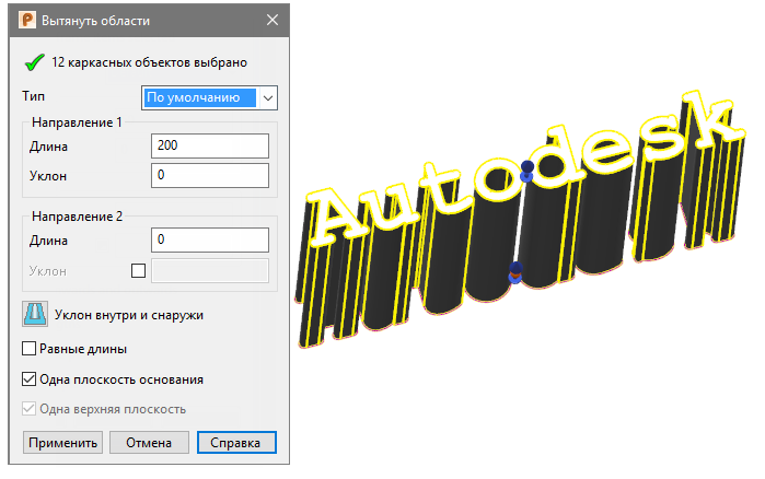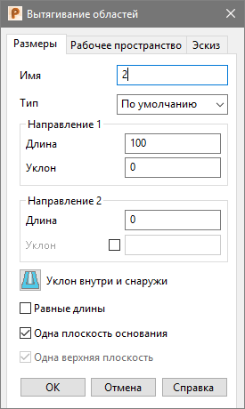 - Откройте вкладку Тело > панель Создать > Область, чтобы открыть диалог Вытянуть области и предварительный просмотр вытягивания: