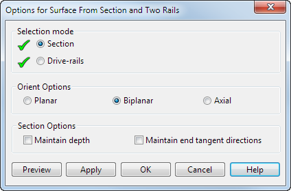 Если вы нажимаете кнопку Дополнительно в диалоге Умный моделировщик поверхностей при создании поверхности с помощью опции По двум направляющим, открывается диалог Параметры поверхности по сечению и двум направляющим. Используйте этот диалог, чтобы задать расширенные опции создания.