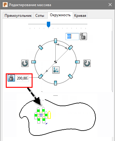Задать радиус массива - радиус массива задан как расстояние между центром и исходным объектом. Нельзя вводить альтернативное значение. Нажмите