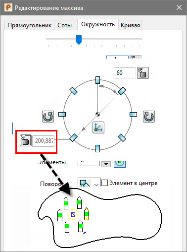 Задать радиус массива - введите нужный радиус расположения элементов вокруг центра массива и нажмите клавишу Enter или Tab. Массив корректируется в соответствии с введенным значением. Эта опция доступна, только когда отображается
