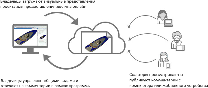 Общие виды используются для совместной работы над визуальным представлением модели или проекта в интерактивном режиме. Например, можно создать общий вид для демонстрации проекта клиенту, который должен его утвердить, или же для специалистов по продажам, которым необходимо наглядно представить свой продукт. После предоставления ссылки на общий вид любой пользователь может просматривать его и оставлять комментарии, даже если у него не установлено программное обеспечение Autodesk. При появлении комментария по общему виду автору проекта направляется сообщение электронной почты. Просматривать комментарии, отвечать на них, а также выполнять другие операции с общим видом можно непосредственно из приложения Autodesk.