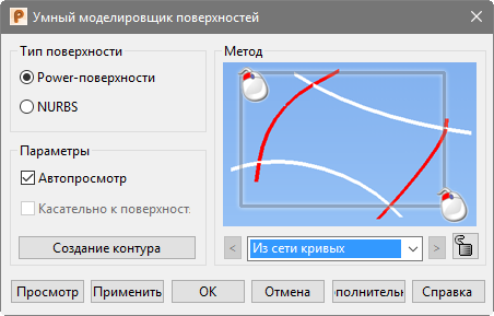 Диалог Умный моделировщик поверхностей используется для создания поверхности из выбранных каркасных объектов, автоматически выбирая лучшее решение из семи доступных методов создания поверхности.