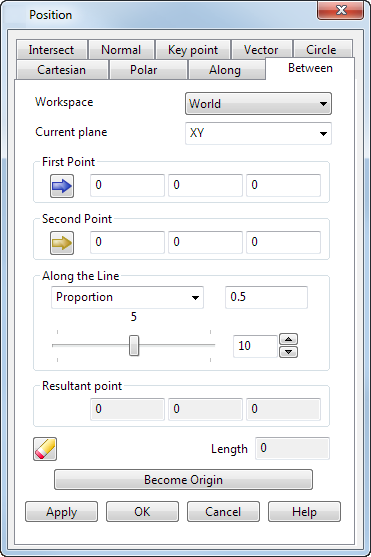 Применить - вводит положение. Если текущая операция допускает несколько точек, диалог остается открытым и готовым к вводу других точек. В противном случае диалог закрывается.