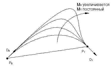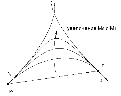 Такие контрольные точки ткже задают направление касательных (D0 и D1) и величины касательных (M0 и M1) в конечных точках (P0 и P1).