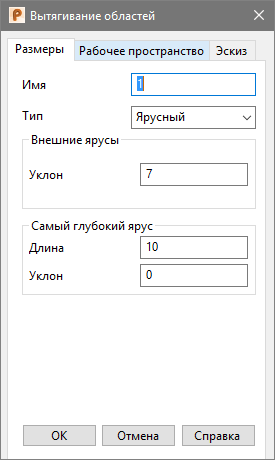 Опции во вкладке Размеры также доступны в процессе Вытягивания областей за исключением опции Имя. Введите Имя вытягивания (если необходимо). Вы также можете использовать имя по умолчанию, назначенное PowerShape.