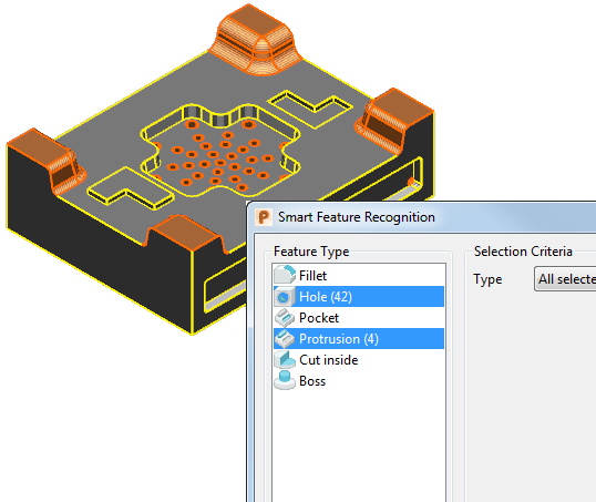 Вы можете использовать диалог Быстрое распознавание элементов для распознавания всех элементов по размерам, заданным отдельно для каждого типа. В следующем примере проиллюстрировано распознавание всех гладких отверстий глубиной более 20 и всех выступов высотой более 10.