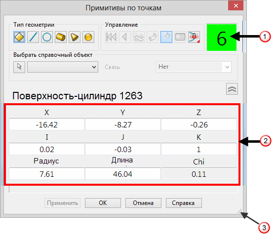 - данная область содержит разные поля, зависящие от типа создаваемого или редактируемого объекта. В них задаются размер и положение геометрии. Введите значения для редактирования новой геометрии. Данный объект создается путем измерения. Значение Chi описывает точность вписывания геометрии в измеренные точки. Чем меньше значение Chi, тем точнее результат.