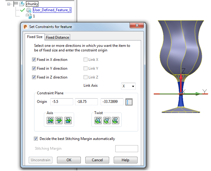 - Используя диалог Установите ограничения для элемента, добавьте ограничитель Фиксированного размера в пользовательский элемент в направлении X, Y, Z, сместив координату Z начала координат Плоскости ограничителей на -33.72899.