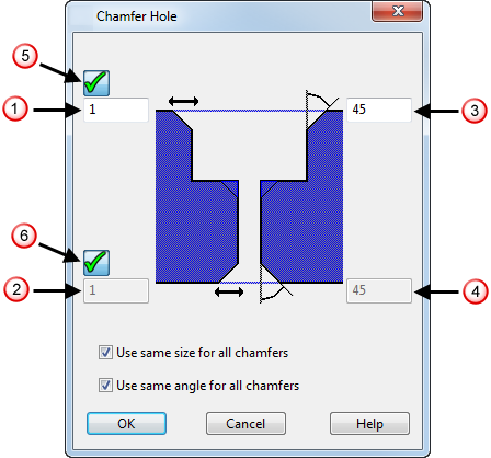 Одинаковый размер для всех фасок - выберите эту опцию, чтобы все фаски, добавляемые к отверстию, имели одинаковый размер. Погасите эту опцию, чтобы задать фаски разных размеров для основания отверстия и для сквозного отверстия путём ввода разных значений в