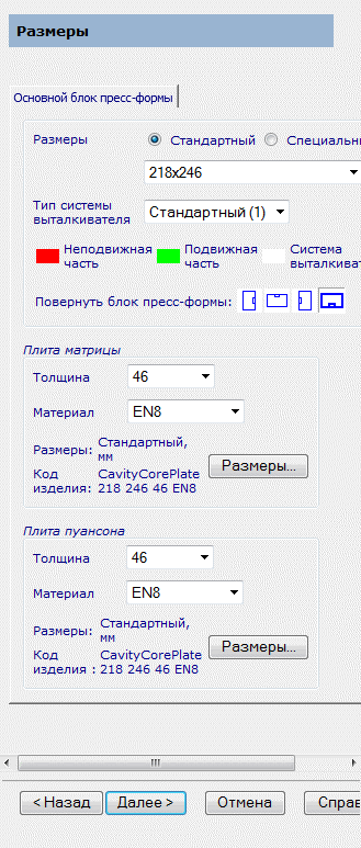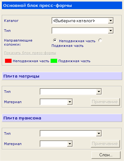 - Плита пуансона - выберите Тип и Материал плиты пуансона, доступной в каталоге.