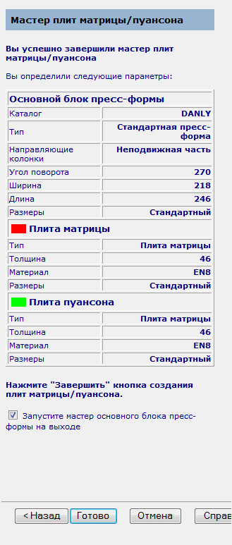 - Нажмите кнопку Готово для создания плит матрицы/пуансона.