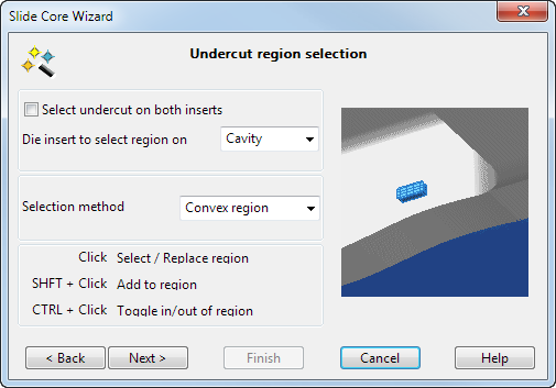 Используйте эту страницу для выбора области поднутрения на вкладышах пресс-формы.
