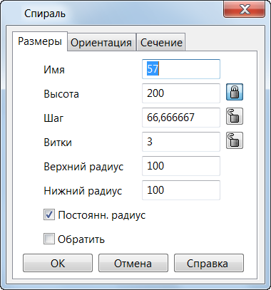Используйте диалог Спираль, чтобы задать и отредактировать размеры, ЛСК и сечения для твердотельной спирали или спиральной поверхности-примитива.