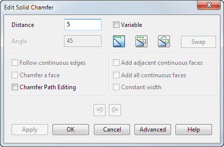 Изменить постоянный размер фаски на переменный, выбрав опцию Дополнительно для открытия диалога Переменная дистанция фаски или выбрав опцию Переменный для ввода нового значения фаски.